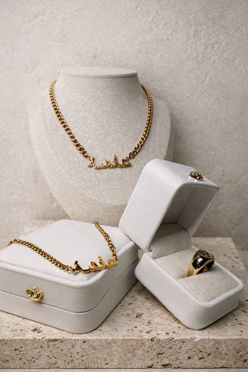 Our Personalised Arabic Name Set is a timeless expression of identity. Custom engraved in elegant Arabic script, each piece is crafted with intention and designed to be cherished.